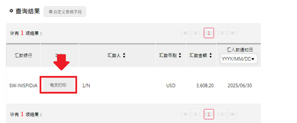 账户查询>存款查询>汇入汇款查询>外币>电文打印