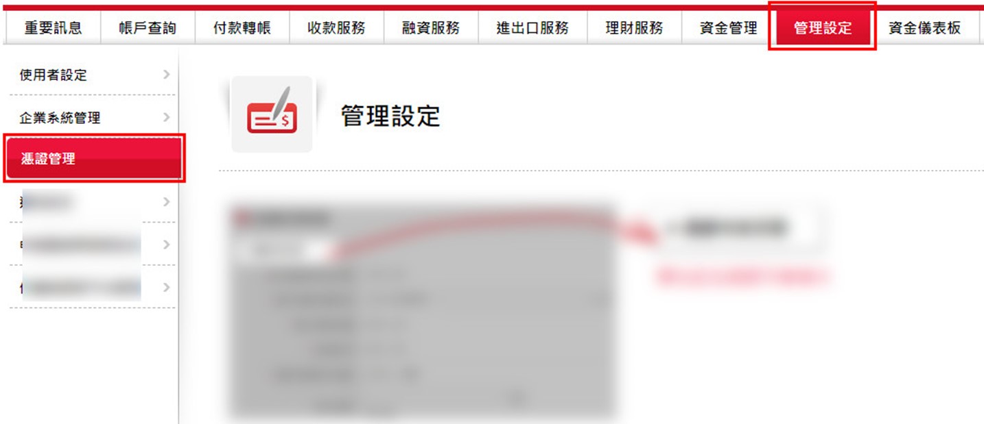 STEP 1. 登入寰宇金融網,點選「管理設定」→「憑證管理」。