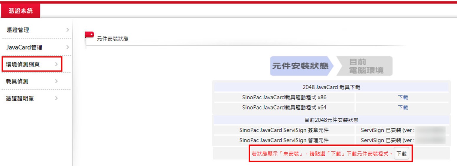 STEP 2. 進入「憑證系統」→點選「環境偵測網頁」→點擊紅字「下載」,並依說明完成元件安裝。